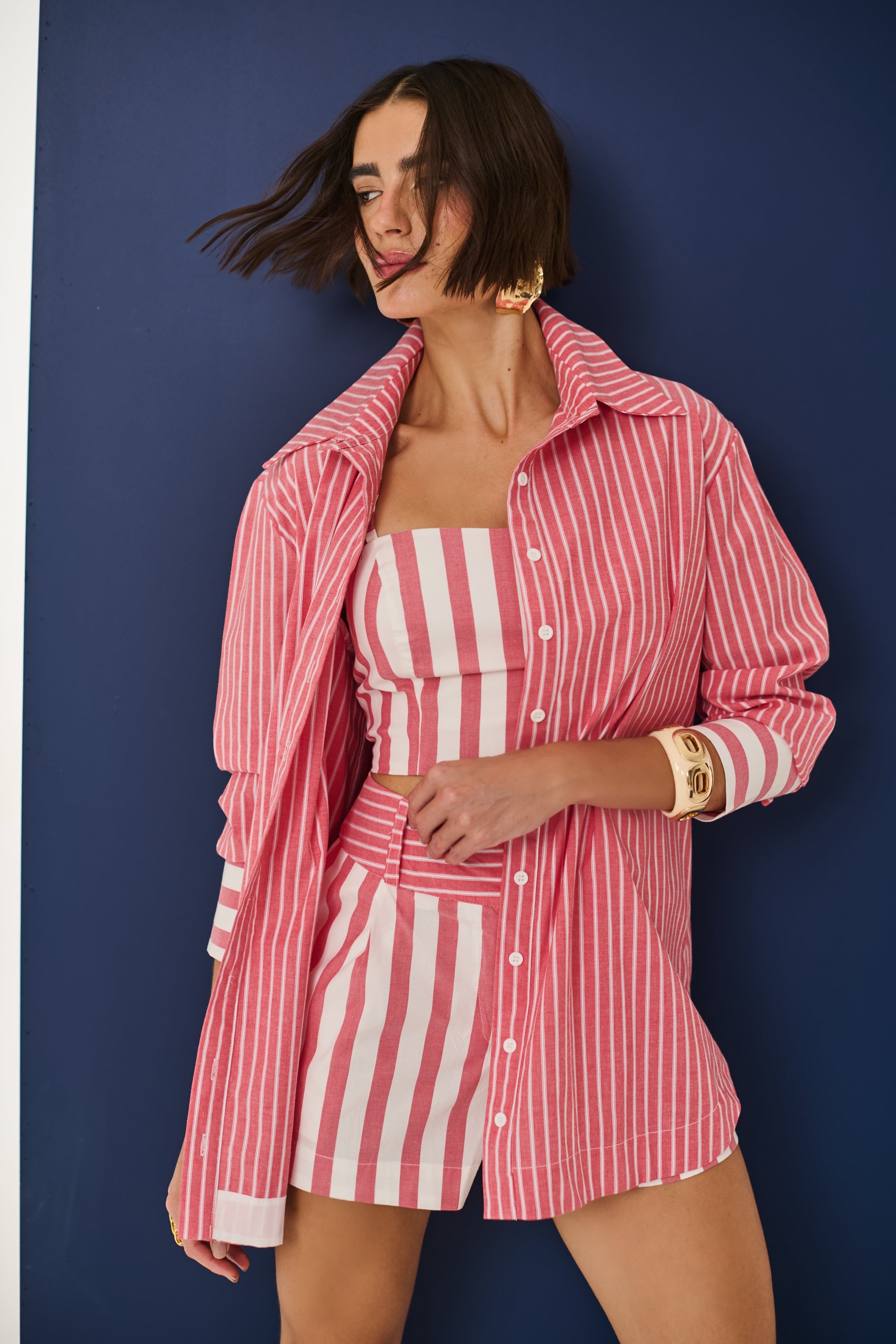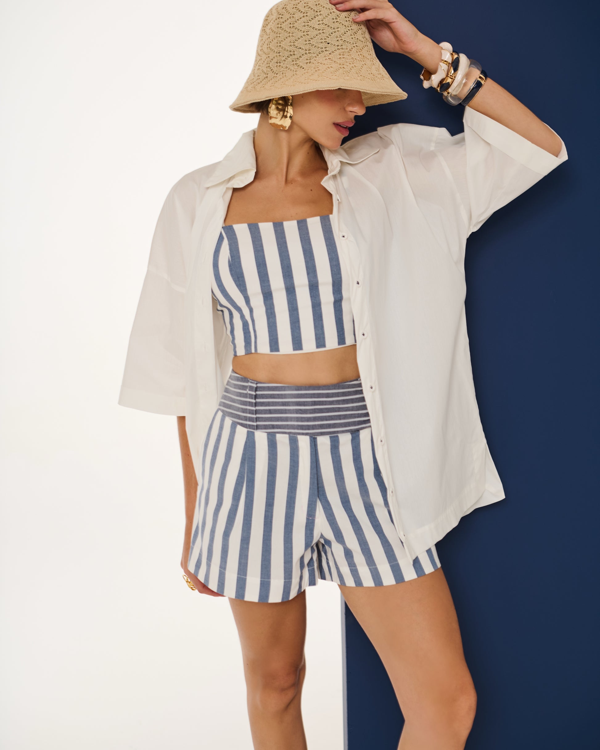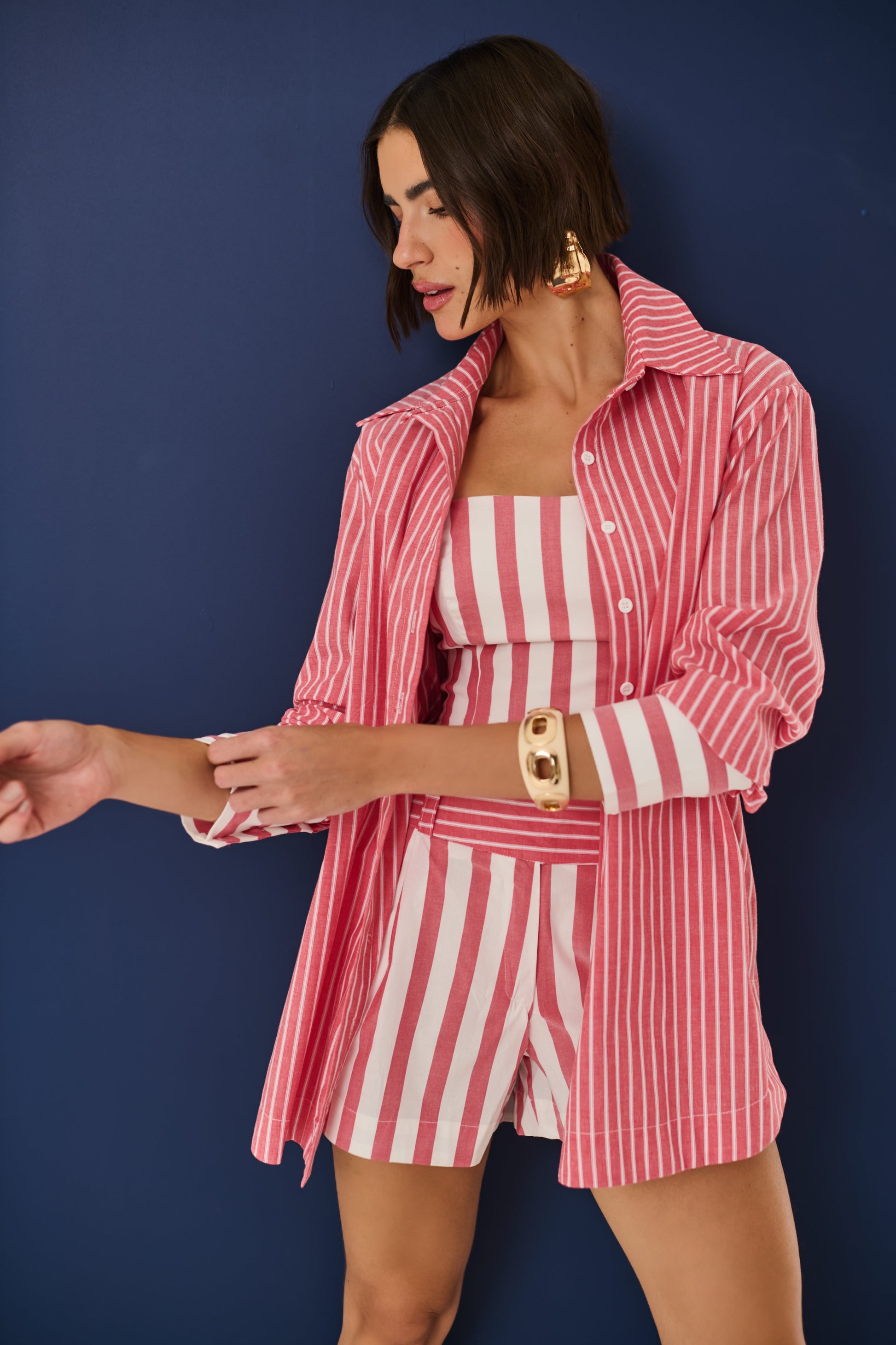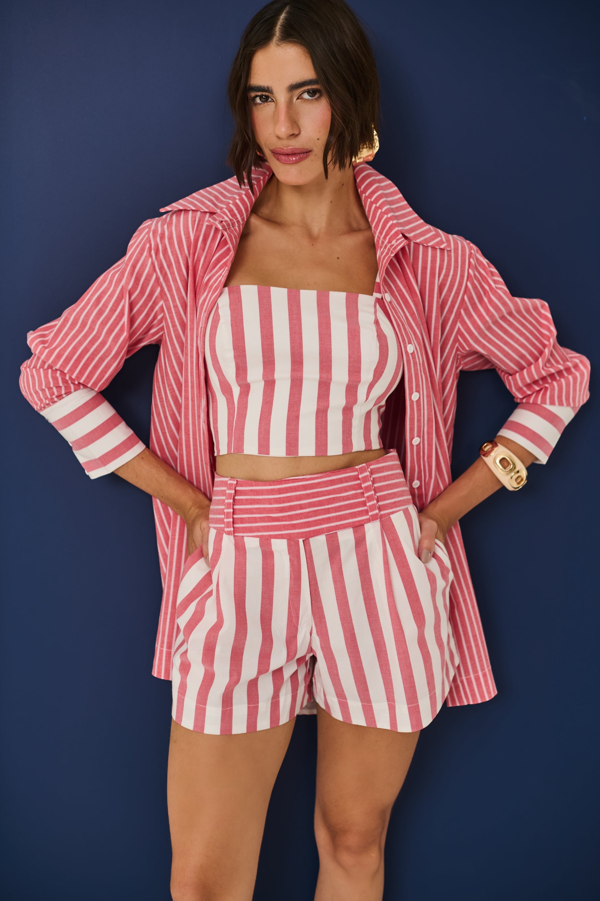 Moderno e cheio de frescor, esse conjunto de short e top é confeccionado em tecido leve com listras verticais que alongam a silhueta e garantem um visual elegante. O short com cintura marcada em listras horizontais cria um contraste sofisticado, destacando a peça com design exclusivo. Versátil e atemporal, é perfeito para composições casuais ou produções mais elaboradas, combinando estilo e conforto em qualquer ocasião.