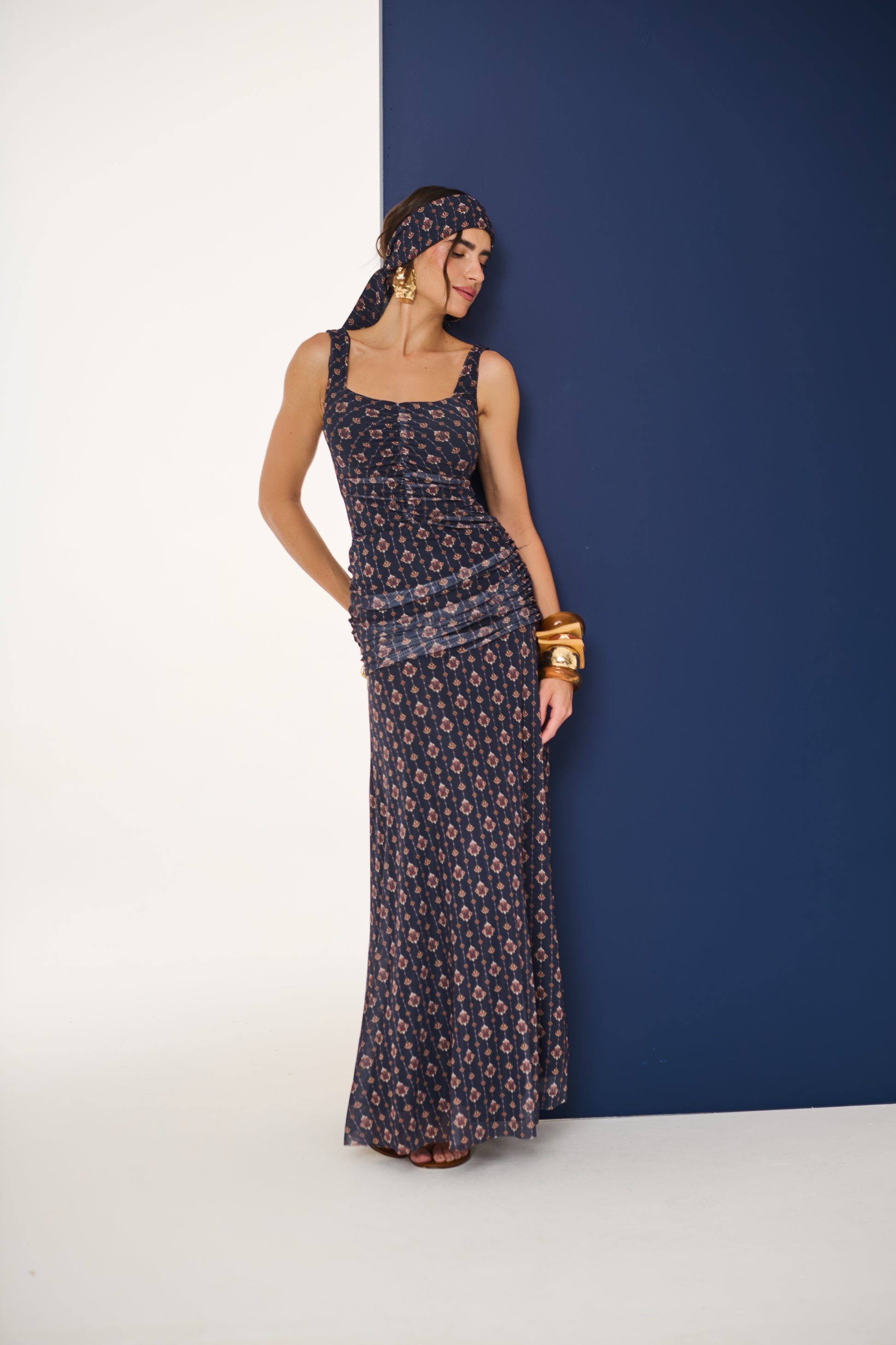 Saia longa em tule, com detalhe franzido no quadril e ampla na barra. Estampa em arabesco!